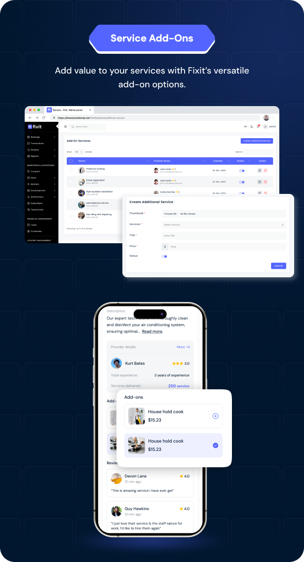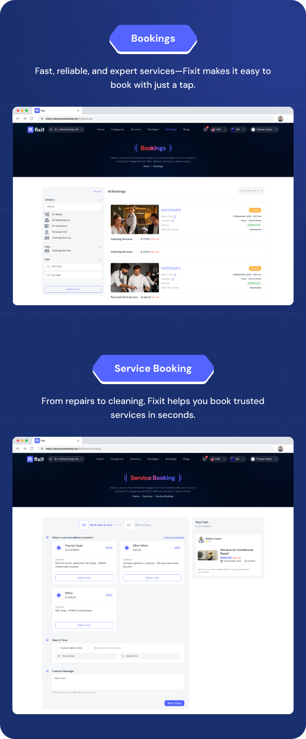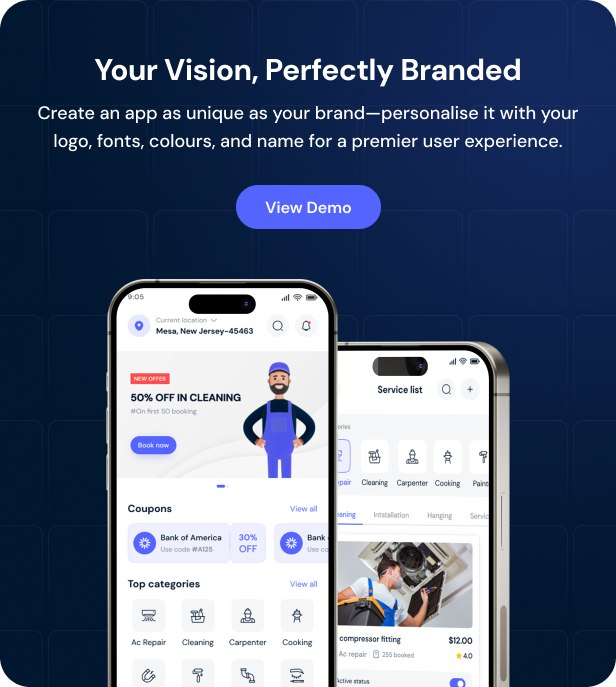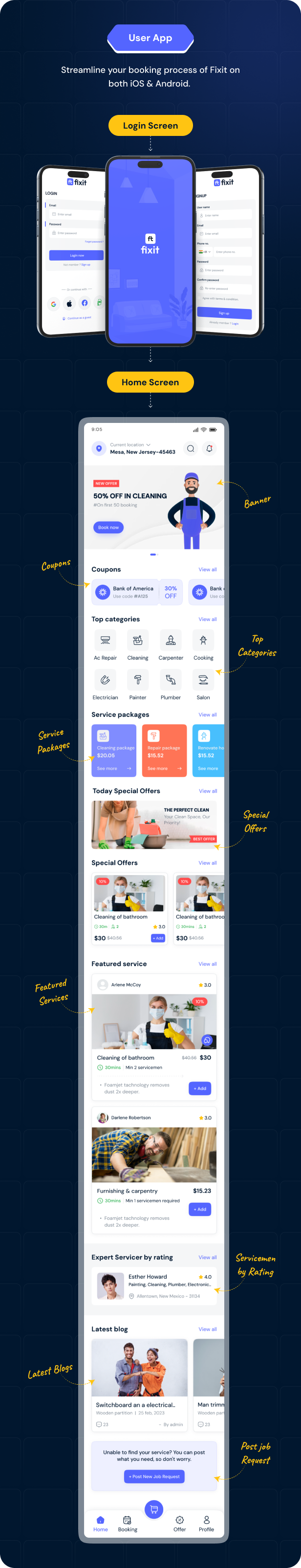 Fixit v2.0 – 多供应商按需服务、家政维修、家庭服务 Flutter 应用程序带完整管理员解决方案源码免费下载。Fixit 用户端是一款服务类应用。在该应用中,用户可预约男女皆宜的美容与健康服务,以及房屋维护与维修服务,包括空调维修、电工、水管工和木工等。用户还可实时查看预订状态,并针对特定预约进行支付。